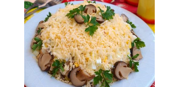 Способ приготовления: На дно глубокого салатника выложить небольшие кусочки куриного филе, обжаренного на растительном масле. На него – маринованный лук. На лук выложить вареный картофель, нарезанный кубиками. Все это залить майонезом. Следующий слой выкладывать половинками фаршированных яиц, которые готовить так: вареные яйца разрезать пополам, вынуть желтки, перемешать их с рубленым чесноком, перцем, солью и майонезом. Яйца уложить на последний слой разрезами вниз. Снова все залить майонезом. Сверху щедро посыпать тертым сыром.