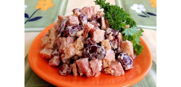 Способ приготовления: Разрезать каждую виноградину пополам, а курицу нарезать кусочками, добавить резаный латук, соль и майонез. Все перемешать. Салат готов!