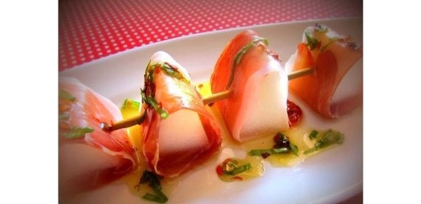 Способ приготовления: Дыню освободить от семян, разрезать вдоль пополам, а затем полукольцами толщиной 1,5—2 см. Так будет легче нарезать кубики, очистив каждый от кожицы. Ветчину – тонкими ломтиками. Каждый кубик дыни уложить на середину ветчины, приподнять края и при помощи зубочистки соединить.