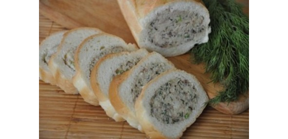 Способ приготовления: Батон обрезать с обеих сторон, вырезать мякиш, чтобы получилась трубочка. Смешать хлебный мякиш с рыбными консервами, измельченными яйцами, пассированный луком, размягченным сливочным маслом, мелко нарезанной зеленью, перцем. Полученной массой очень плотно начинить батон и положить его в холодильник на 1—2 часа.