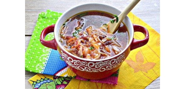Способ приготовления: Отварить отдельно мелко нарезанные грибы, затем вынуть их из бульона. На сковороде поджарить нашинкованный лук, измельченную соломкой морковь и отварные грибы с добавлением томата – пюре. В кастрюле с водой отварить нашинкованную капусту в течение 40—50 минут. Далее к капусте добавляем пережаренные овощи, поджаренную до коричневого цвета муку, соль,, перец, лавровый лист, а также свежую зелень.