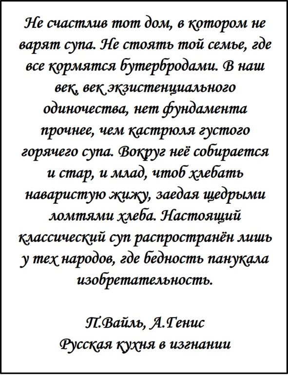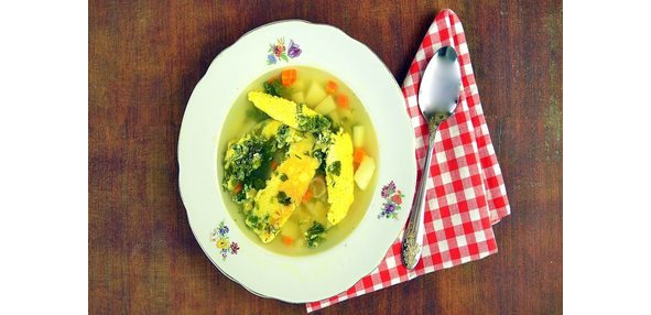 Способ приготовления: Сварить мясной бульон и процедить его. Репчатый лук нашинковать, морковь порезать или натереть соломкой и поджарить их на сливочном масле до золотистого цвета. Бульон довести до кипения положить в него нарезанный кубиками картофель, варить пять минут. Затем добавить пережаренные овощи, довести до кипения, всыпать лапшу или вермишель, посолить, поперчить и добавить лавровый лист. Варить еще 15—20 минут. Перед подачей на стол добавить зелень.