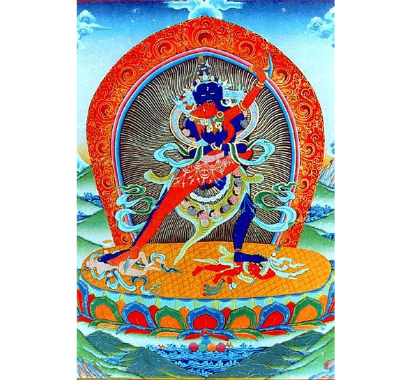Стою, вытянув правую ногу, равно соединившись с Матерью Ваджраварахи красного цвета, держащей дигуг и капалу.