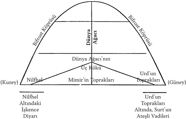 Dokuz diyarı bağlayan ağaca Yggdrasil3 diyorlardı. Üç ana kökü, yeraltı diyarında bulunan üç kaynakla sulanıyordu. Bu ağacın kökçükleri Surt’un derin vadilerine ve işkence diyarına kadar ulaşıyordu. Bu muhteşem ağacın dalları en ücra topraklara bile uzanıyor, özüyle her yere hayat taşıyordu. Yılanlar onun kökleriyle besleniyor; geyikler, sincaplar ve kuşlar onun dalları arasında yaşıyordu. Asgard’ın çok çok üstünde yer alan en üstteki dalında ise horoz Vidofnir tüm ışığıyla göz alıyordu. Yggdrasil, tam anlamıyla bir “hayat ağacı”ydı.