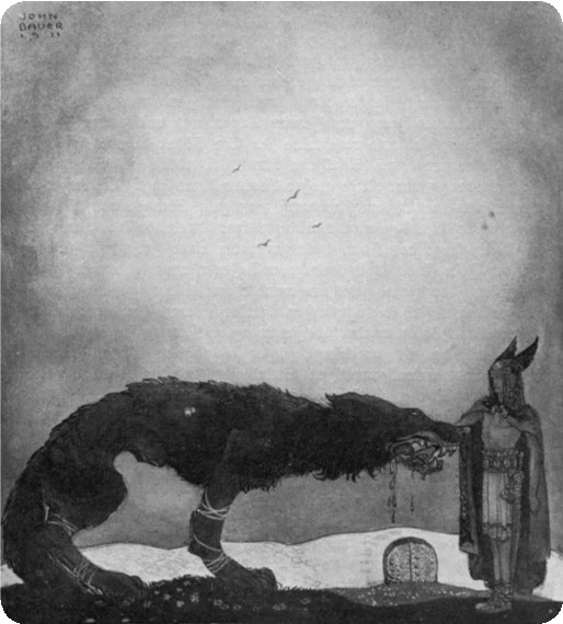 Odin, Fenrir’i, Niflheim’in altındaki işkence topraklarının19 birinde bulunan kayalık bir ada üzerindeki karanlık bir mağaraya gönderdi. Toprağın alt tabakalarında bulunan bir taşa zincirlendi, çenesini açık tutmak için ağzına bir kılıç yerleştirildi; öyle ki, kılıcın kabzası alt çenesine, ucuysa damağına sabitlenmişti. Ağzından zehirli bir nehir doğup akmaya başladı. Fenrir, Tanrıların Alacakaranlığı -yani Ragnarök- gelene dek orada kalacaktı.