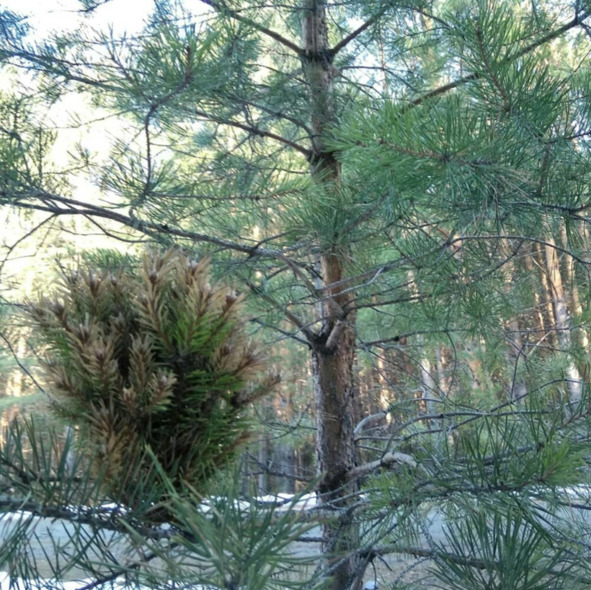 Сосна помахала нам букетиком. Я не поленилась, спустилась с дороги. Что за чудеса? На сосновой ветке, на самом её кончике пустилось в рост новое деревце! Смешное, ершистое! Толи ёлка, толи сосёнка? Буду наблюдать за этим природным экспериментом!