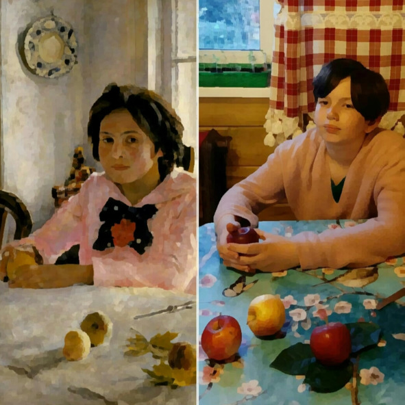 Прислали мне «живые» картины: Маша – «Кормление кроликов» Эмиля Мунье. Платон – «Девочка с персиками» Валентина Серова. В нашем случае «Мальчик с яблоками»