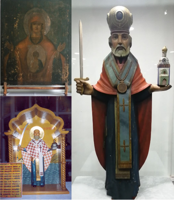 Иконы «Знамение Пресвятыя Богородицы», Котокельский образ Святителя и чудотворца Николая и Святителя Христова Николая Голоустенского (восстановленная, в киоте).