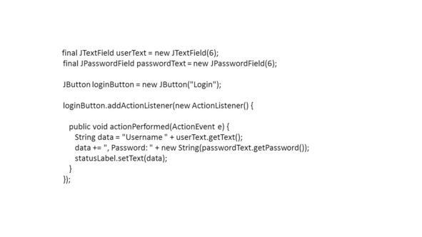Второе отличие заключается в том, что вместо метода getText для получения текста из поля пароля используется метод getPassword, возвращающий массив символов типа char, а не строку.