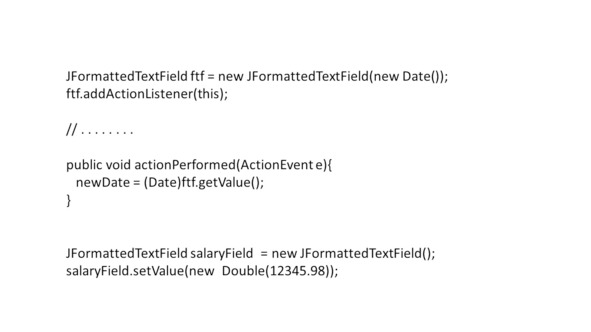 Класс JFormattedTextField расширяет класс JTextField и обеспечивает вывод объекта в текстовую строку.