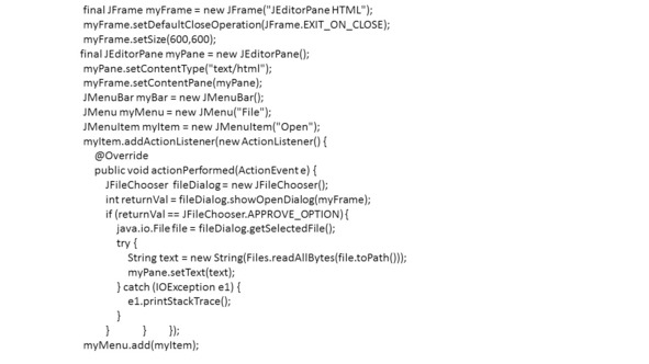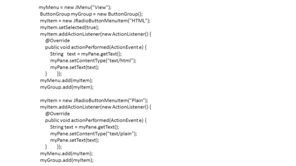 Далее мы создаем меню для загрузки контента в компонент JEditorPane.