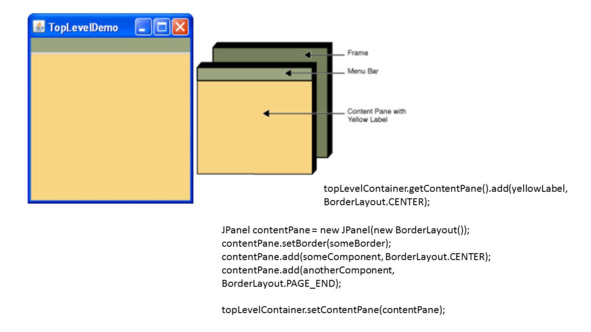 Однако можно создать панель JPanel и установить ее как панель содержимого, используя метод setContentPane контейнера верхнего уровня.