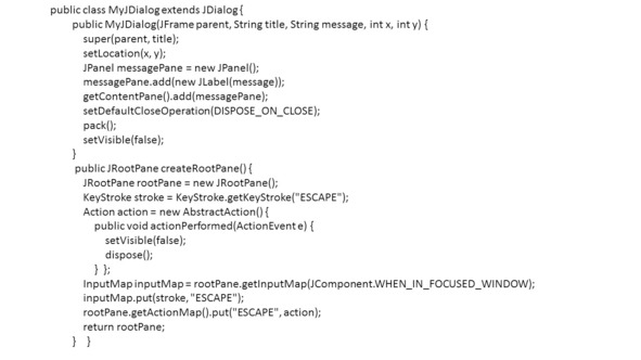 В этом методе используется метод getKeyStroke класса KeyStroke для установки нажатия клавиши ESCAPE.