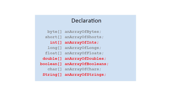 Мы объявляем массив, указывая тип элементов, затем открываем и закрываем квадратные скобки, и затем указываем имя, которое мы выбрали для нашего массива.