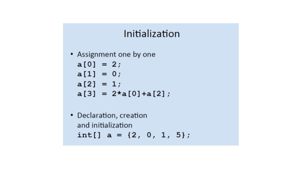 Мы также можем объявить, создать и инициализировать массив сразу, как мы видим здесь, в последней строке, используя фигурные скобки.