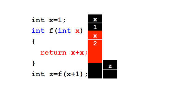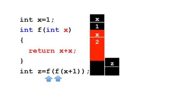 В этом примере мы видим, что эта локальная переменная – этот параметр – создается дважды: во-первых, для внутреннего вызова f с x плюс 1, со значением 2, – и второй раз для внешнего вызова со значением 4.