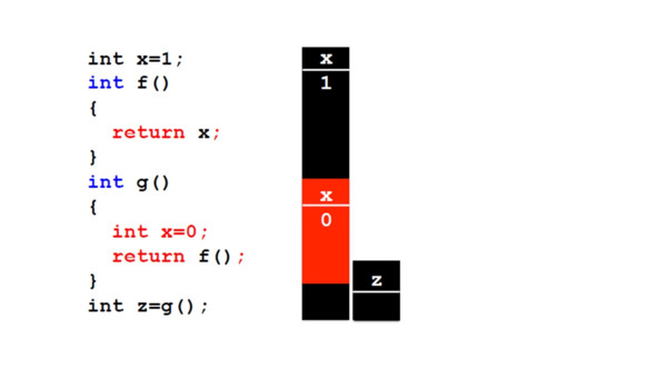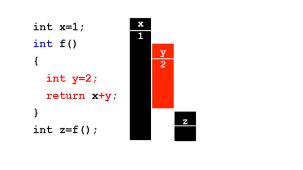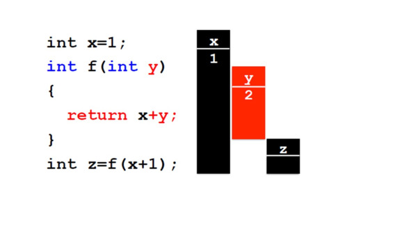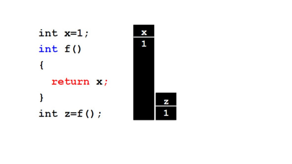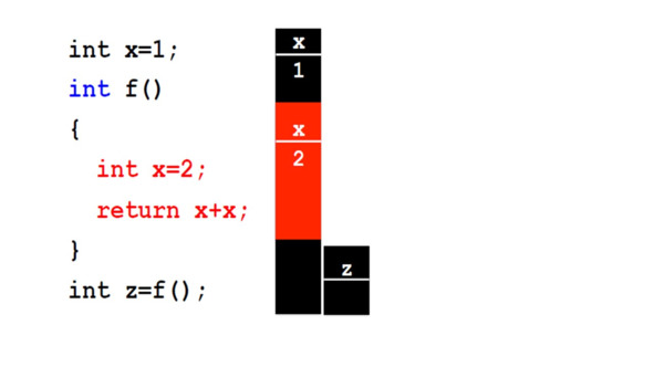 Когда мы вызываем f для вычисления z, мы вызываем f, где внутри определяется x со значением 2.