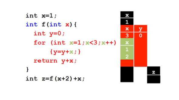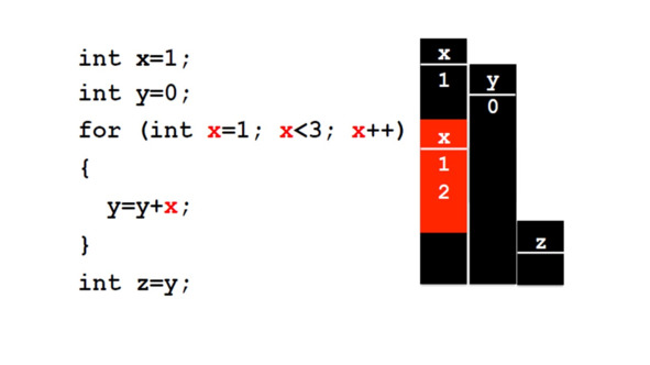 Здесь, мы объявляем другую переменную x, которая делает невидимыми предыдущие две переменные x, пока мы не выполним цикл for.