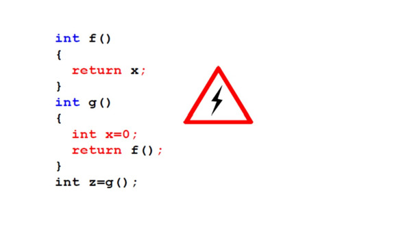 Теперь, если мы удалим самое верхнее объявление x, переменная x не определяется при объявлении f.