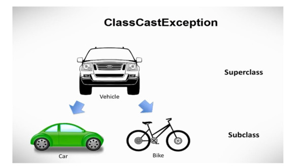 Чтобы проиллюстрировать это исключение, рассмотрим эту иерархию классов, где Vehicle является суперклассом, и Car и Bike – это подклассы.