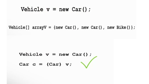 Это приведение правильное и позволяет нам воспользоваться свойством полиморфизма, сохраняя в одном массиве Vehicle набор объектов классов Car и Bike.