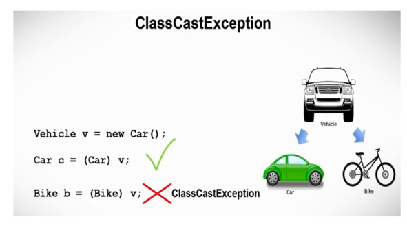 Однако, если мы попытаемся применить этот экземпляр к объекту класса Bike, программа выбросит ClassCastException во время выполнения, потому что объект в переменной «v» не является байком.