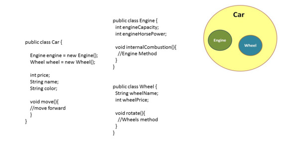 Когда создается экземпляр автомобиля, оба – двигатель и колесо будут доступны для автомобиля, а когда будут изменения этих типов (двигателя и колеса), изменения будут ограничиваться только этими классами и не будут влиять на класс Car.