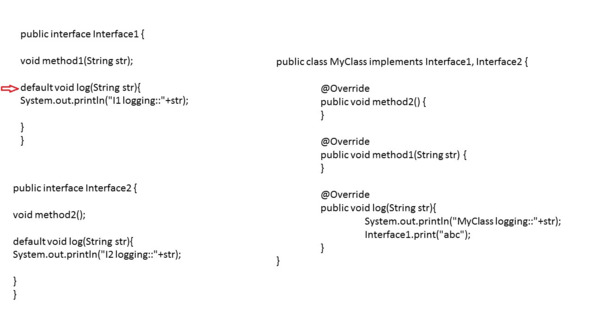 И поэтому, если класс реализует оба вышеупомянутых интерфейса, он должен будет обеспечить реализацию для метода log, иначе компилятор будет выбрасывать ошибку времени компиляции.