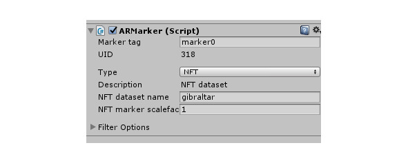 Для использования NFT маркера в свойствах ARMarker скрипта в поле Type выберем NFT, в поле NFT dataset name введем имя набора данных из каталога StreamingAssets.