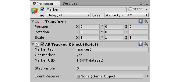 ARMarker скрипт обеспечивает маркер отслеживания, к которому прикрепляется 3D модель. В поле Marker tag введем идентификатор маркера.