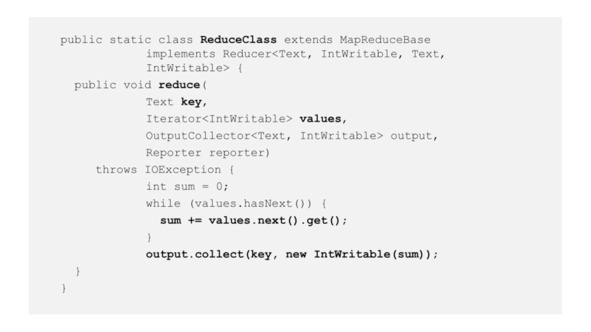 Здесь у нас есть ReduceClass, который имеет функцию reduce, получающую на вход ключ и значения, потому что у вас могут быть много значений, связанных с данным ключом.