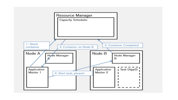 Затем есть Application Master, или мастер приложения, который также работает на одном из серверов, и отвечает за согласование контейнеров с диспетчером ресурсов и менеджерами узлов.