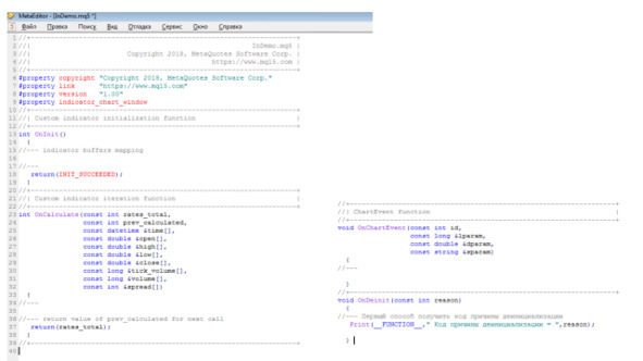 Для обработки вышеуказанных событий необходимо описать такие функции как OnInit (), OnDeinit (), OnCalculate () и OnChartEvent ().
