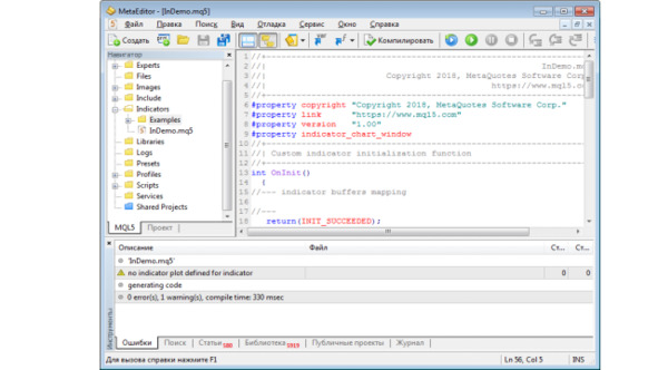 Для компиляции нашего индикатора нажмем кнопку Компилировать редактора, при этом в нижнем окне отобразится результат компиляции.