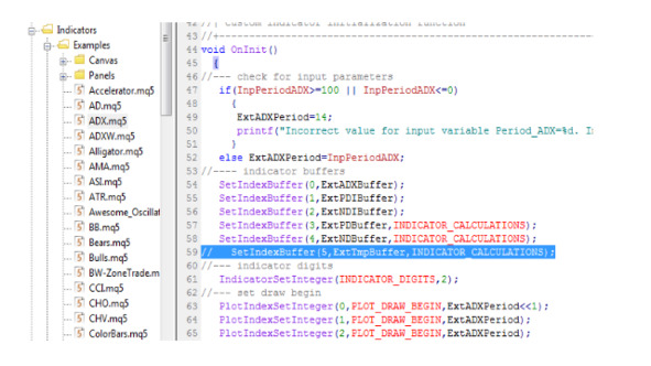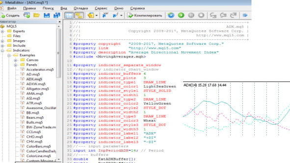В редакторе MQL5, в окне Navigator (Навигатор), в разделе Indicators-> Examples выберем и откроем исходный код индикатора ADX.