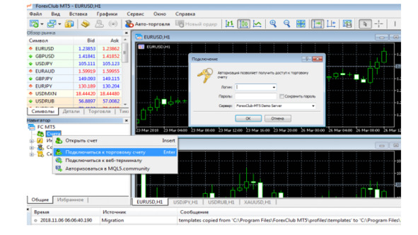 И подключимся к серверу Forex Club, используя логин и пароль демо счета.