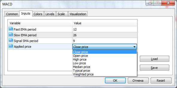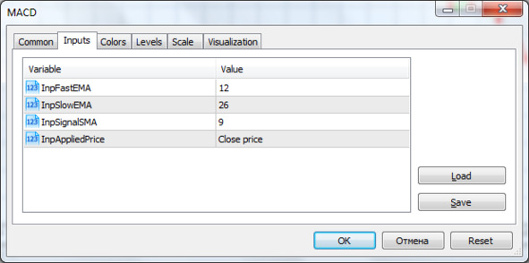 Тут пользователь может поменять параметры индикатора по умолчанию, и индикатор присоединится к графику с уже измененными параметрами.