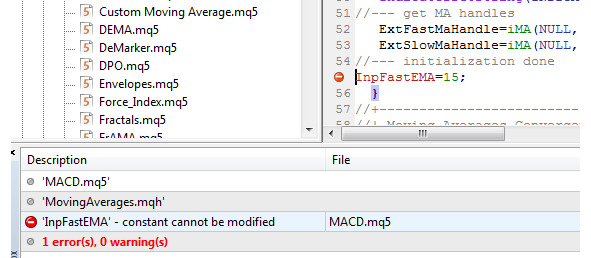 Если в коде индикатора попытаться изменить значение входного параметра, при компиляции возникнет ошибка: