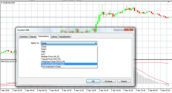 Здесь пункт First Indicator’s Data означает, что в качестве массива price [] будет использоваться массив ExtMacdBuffer буфера индикатора MACD, а пункт Previous Indicator’s Data означает, что в качестве массива price [] будет использоваться массив ExtLineBuffer буфера индикатора MA.