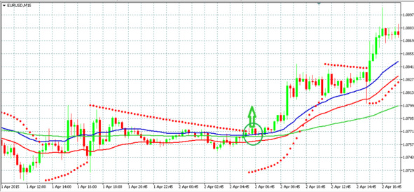 Сигнал на покупку: зеленая свеча закрывается выше EMA34 High и EMA34 Low, зеленая свеча выше EMA125 и Parabolic SAR.