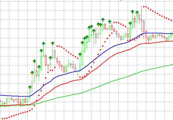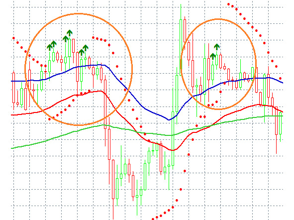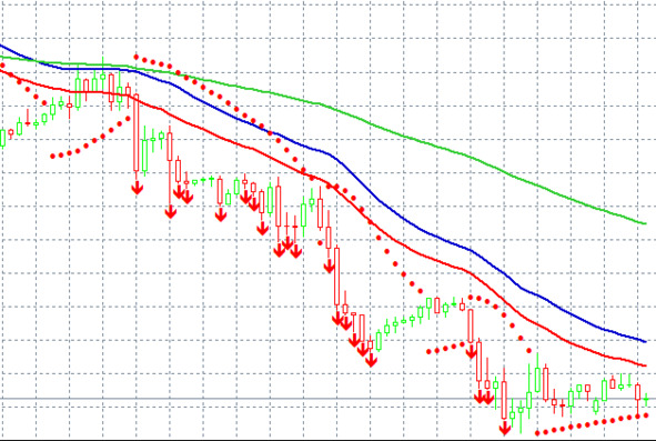 for (int i=start; i { IKBuyBuffer [i-1] =0; ColorIKBuyBuffer [i-1] =1; IKSellBuffer [i-1] =0; ColorIKSellBuffer [i-1] =1; if (close [i-1]> open [i-1] &&close [i-1]> EMA34HBuffer [i-1] &&close [i-1]> EMA34LBuffer [i-1] &&low [i-1]> EMA125Buffer [i-1] &&low [i-1]> PSARBuffer [i-1] &&EMA125Buffer [i-1] IKBuyBuffer [i-1] =high [i-1]; ColorIKBuyBuffer [i-1] =0; } if (close [i-1] IKSellBuffer [i-1] =low [i-1]; ColorIKSellBuffer [i-1] =0; } } bars_calculated=calculated; // – - return value of prev_calculated for next call return (rates_total); } Здесь мы рассчитываем индикатор на предыдущем баре, так как на текущем баре цена close – это текущая цена тика. Откомпилируем код и присоединим индикатор к графику: Мы увидим, что, в общем и целом, индикатор дает верные сигналы на продажу и покупку, хотя в некоторых случаях он запаздывает и дает ложные сигналы: Как мы видим, происходит это из-за трендовой линии EMA125. Попробуем отвязать ее от текущего периода и попробуем определять тренд, скажем по дневному графику: