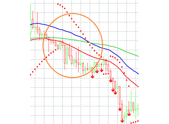Сигнал на продажу: красная свеча закрывается ниже EMA34 Low и EMA34 High, красная свеча ниже EMA125 и Parabolic SAR.