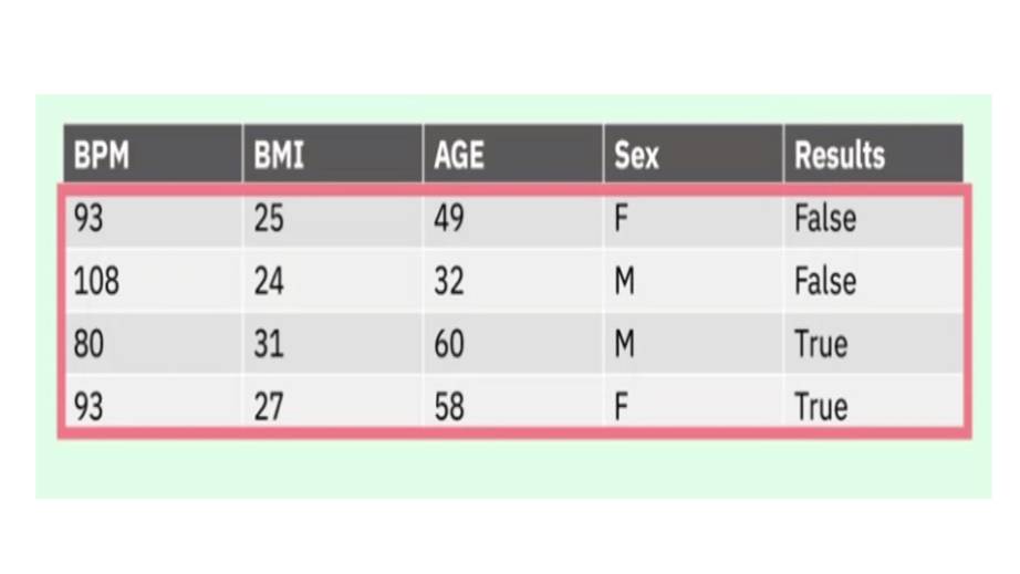 Хотя для этого есть много разных алгоритмов, с точки зрения непрофессионала, если вы тренируете модель, чтобы предсказать, будет ли сердце работать нормально или нет, есть истинные или ложные значения, и вы будете показывать алгоритму некоторые реальные данные, помеченные как истинные, затем снова показывая данные, помеченные как ложные, и вы будете повторять этот процесс с данными, имеющими истинные или ложные значения.