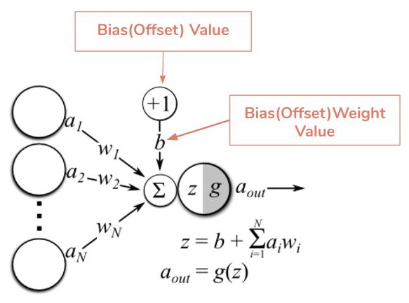 Скрытые и выходные узлы имеют свойство, называемое смещением bias, которое представляет собой особый тип веса, который применяется к узлу после рассмотрения других входных данных.