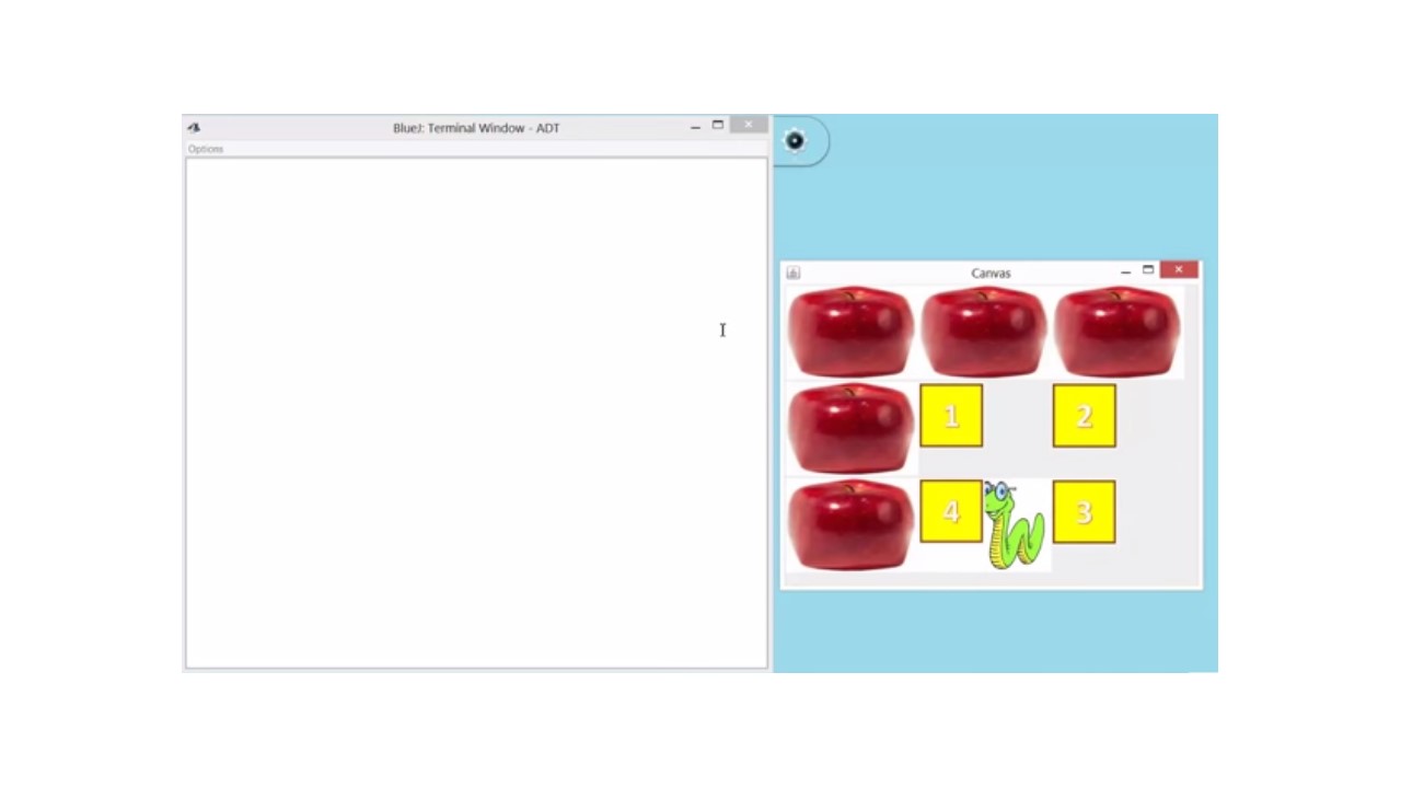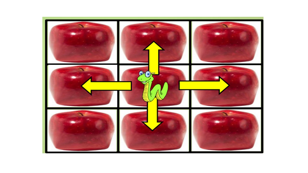 Рисунок показывает, что червь начинает с середины. После того, как заканчивается среднее яблоко, он может двигаться в одну из четырех клеток на стороне, но не в углу. Таким образом, червь может двигаться вправо, двигаться вниз, двигаться влево и двигаться вверх.