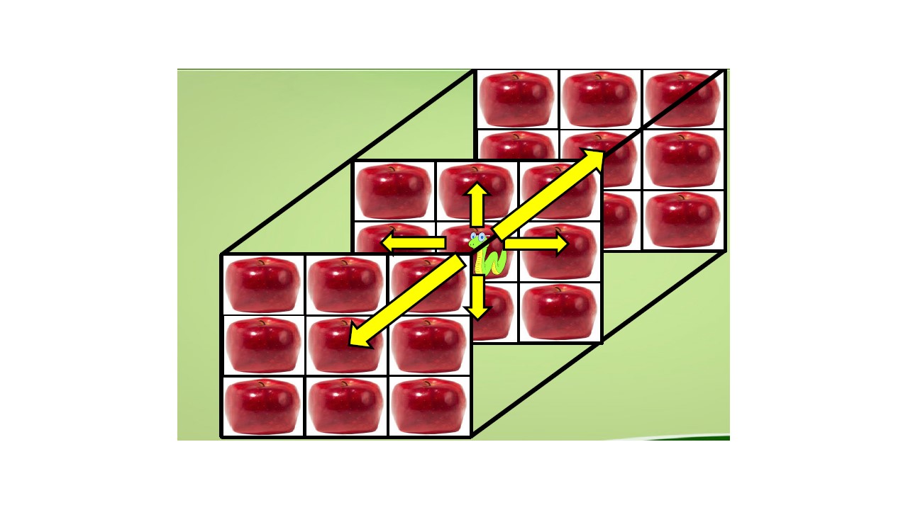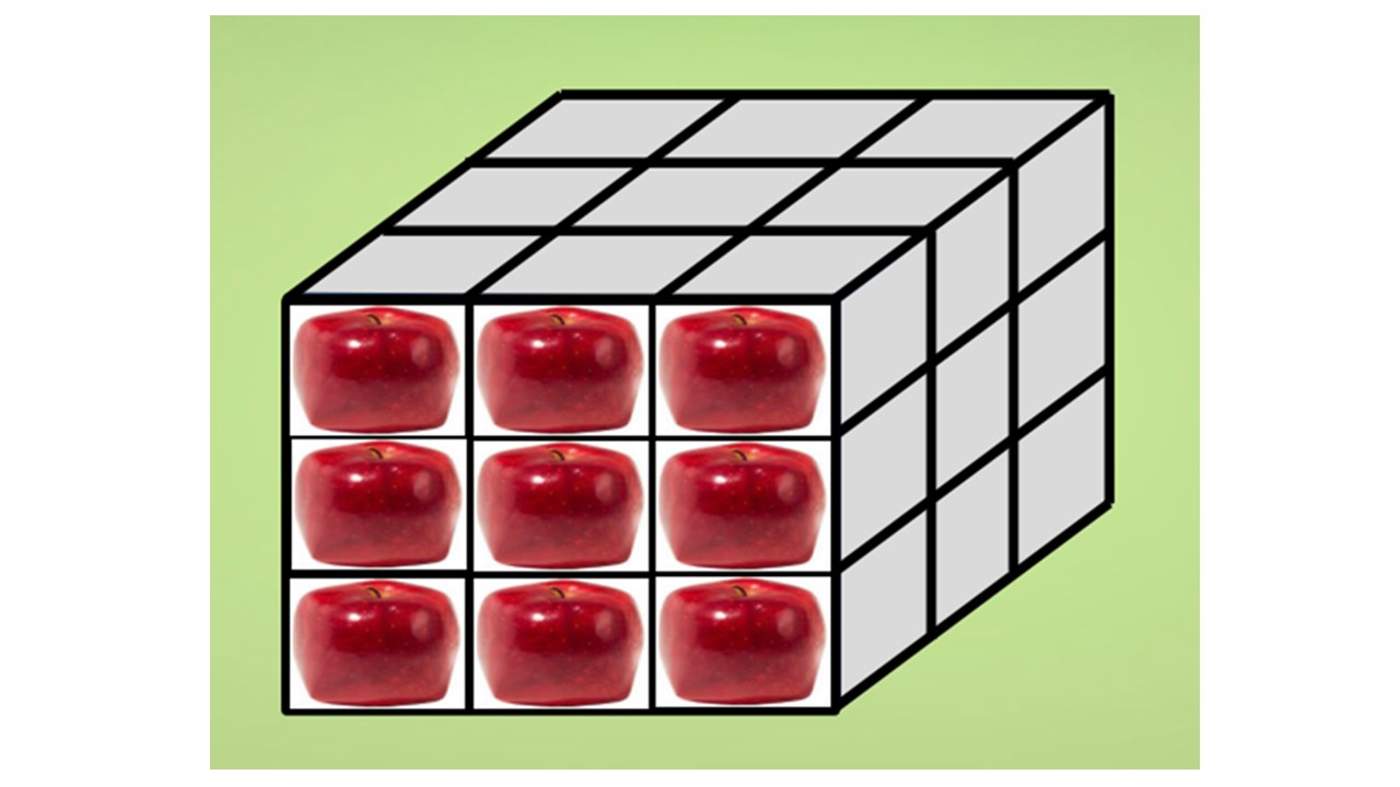 То есть, есть в общей сложности, есть 27 яблок. Чтобы помочь вам визуализировать проблему, диаграмма здесь отображает куб в три слоя.