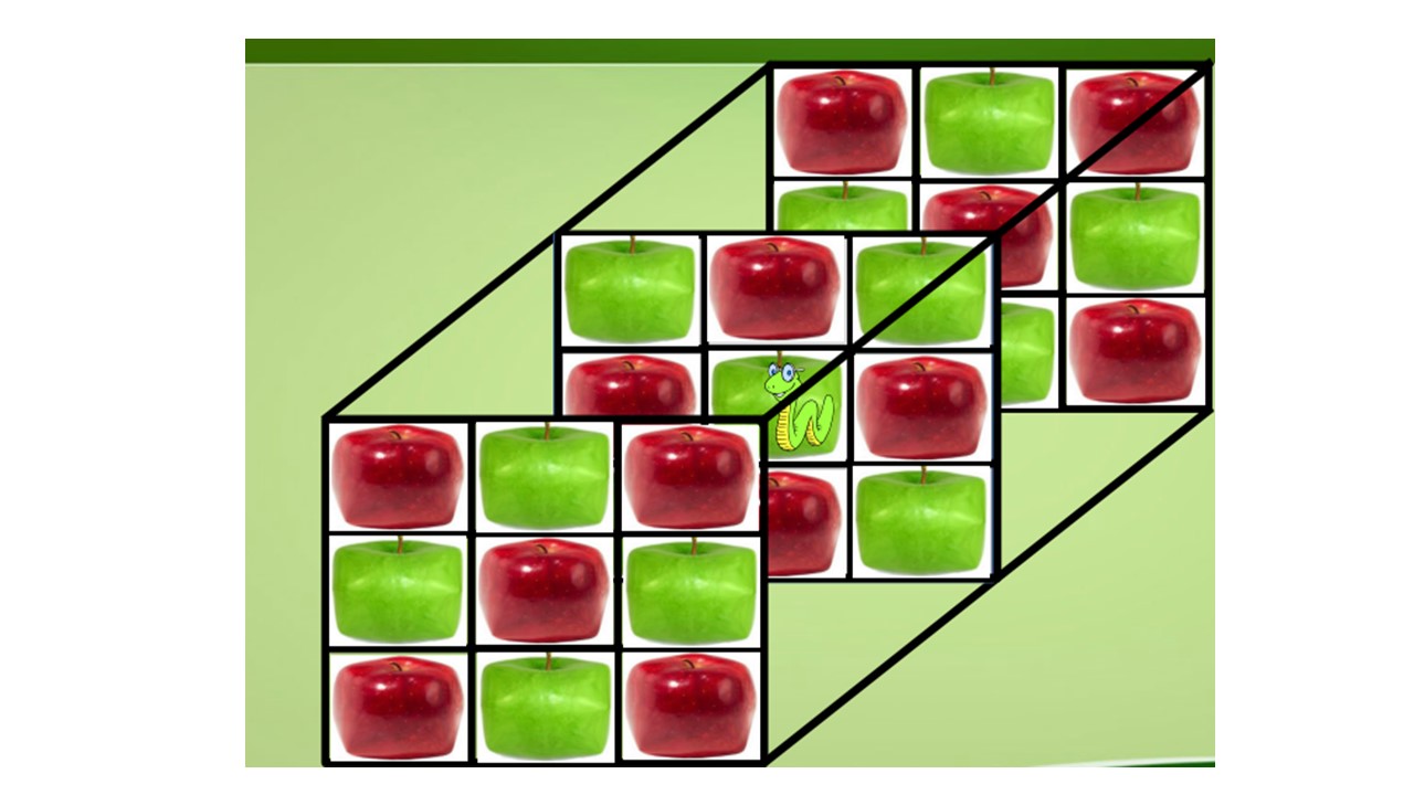 Из задачи 2D квадратных яблок, мы можем наблюдать, что червь сможет съесть все яблоки, если он начинает с ячейки с красным яблоком. Применяя то же правило в задаче квадратных яблок 3D, мы можем быстро сказать, что червь не сможет съесть все яблоки, если он начинает из центра куба, в котором содержится зеленое яблоко. Аналогичным образом можно быстро сказать, что червь может съесть все яблоки, если он начинает с угла куба, который содержит красное яблоко.