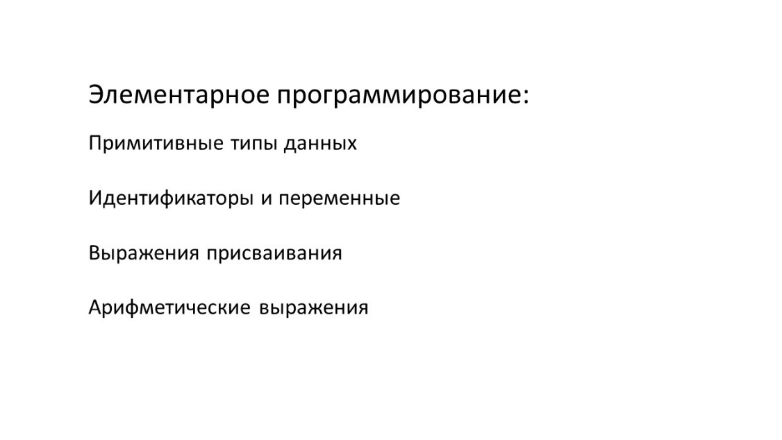 В этом разделе мы собираемся рассмотреть некоторые элементарные понятия программирования, в том числе примитивные типы данных, идентификаторы и переменные, операторы присваивания и арифметические выражения.
