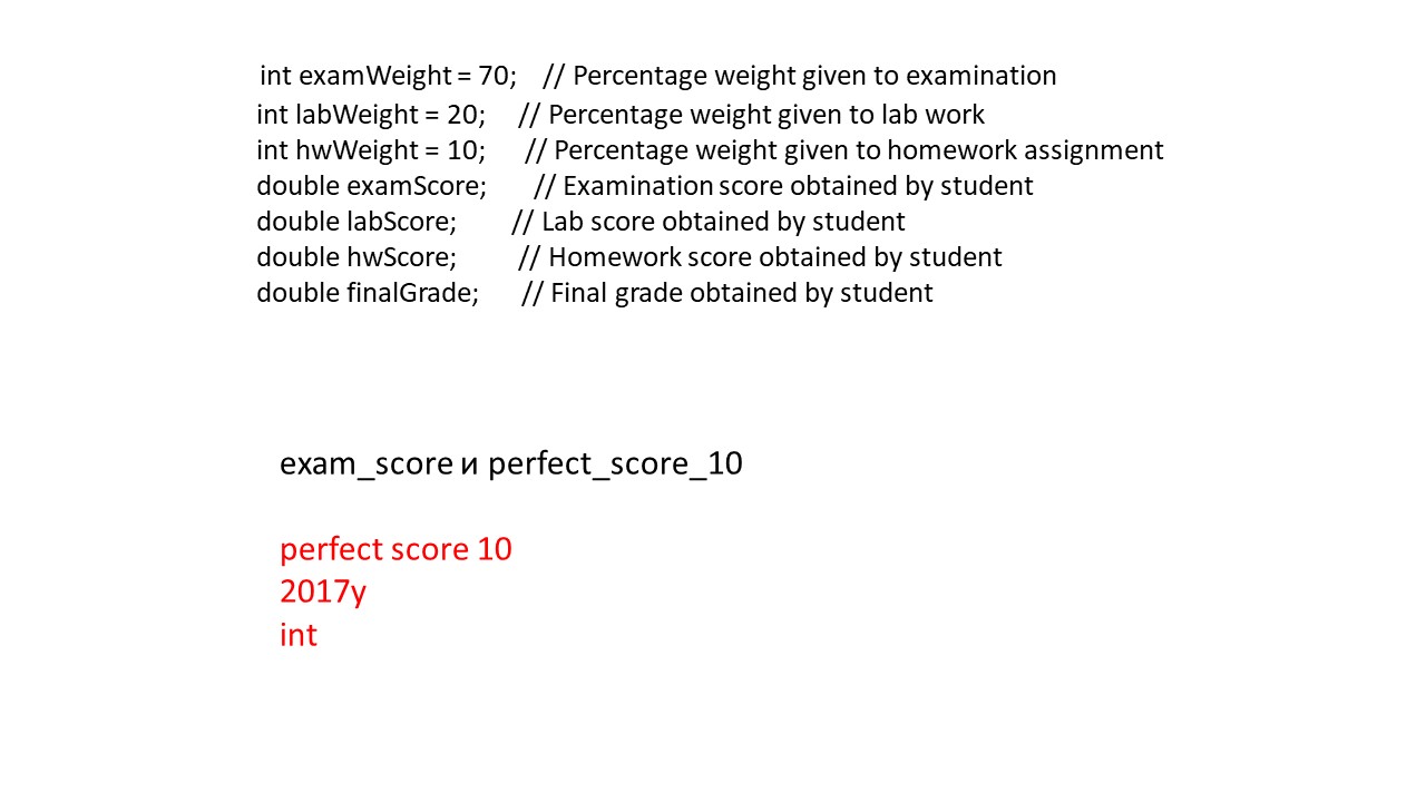 Раньше вы видели, что examWeight и examScore были использованы в предыдущей программе, и они являются допустимыми идентификаторами. Вы также видели слова int и double.