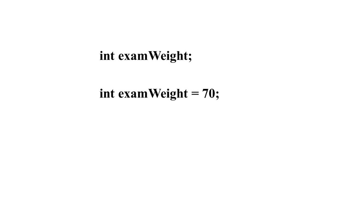 В примере, который мы видели, объявление int examWeight = 70 объявляет и инициализирует examWeight.